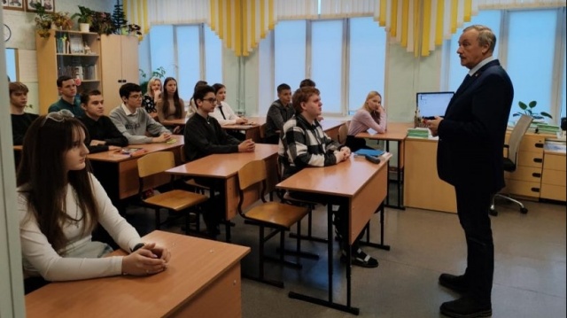 В разговоре со старшеклассниками ветеран боевых действий в Афганистане Леонид Рыбин рассказал о причинах и событиях афганской войны, о мужестве и стойкости наших воинов при выполнении интернационального долга. Поделился своими воспоминаниями о Герое России лейтенанте Сергее Амосове, чье имя носит школа.