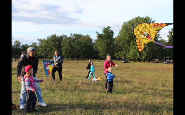 В фестивале принимали участие несколько команд. Взрослые и дети соревновались, у кого выше взлетит змей.