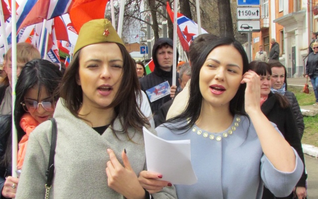 С песнями под гармошку, с флагами в руках и георгиевскими лентами на груди, родинцы прошли от центральной площади города к Вечному огню и возложили цветы у мемориала на берегу реки Вятки. Многие из них с портретами родственников – участников войны двигались в колонне "Бессмертного полка".