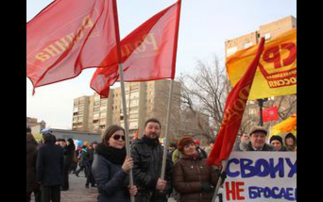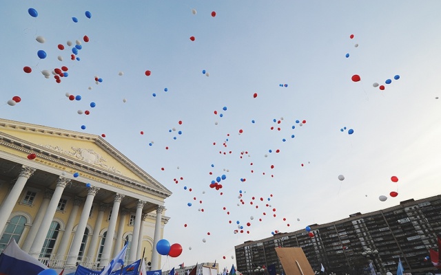 Жители Тюмени вышли на площадь с шарами, транспарантами и плакатами. Люди скандировали единый лозунг: "Крым! Тюмень! Россия!".
