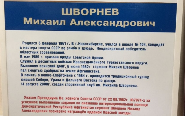 Михаил Шворнев – выпускник новосибирской школы №104, кандидат в мастера спорта по самбо и дзюдо, неоднократный победитель областных соревнований. В 1982 году сержант Шворнев пал смертью храбрых в республике Афганистан. В память о погибшем земляке, награжденном посмертно орденом Красной звезды, в Новосибирске проводятся спортивные поединки. В этом году соревнования организованы при участии партии "РОДИНА" Дзержинского отделения.