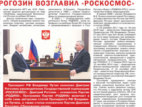 Газету открывает материал об основателе Партии «РОДИНА» Дмитрии Рогозине, публикуется его биография. Президент РФ Владимир Путин назначил Д.О. Рогозина руководителем Государственной корпорации "РОСКОСМОС".